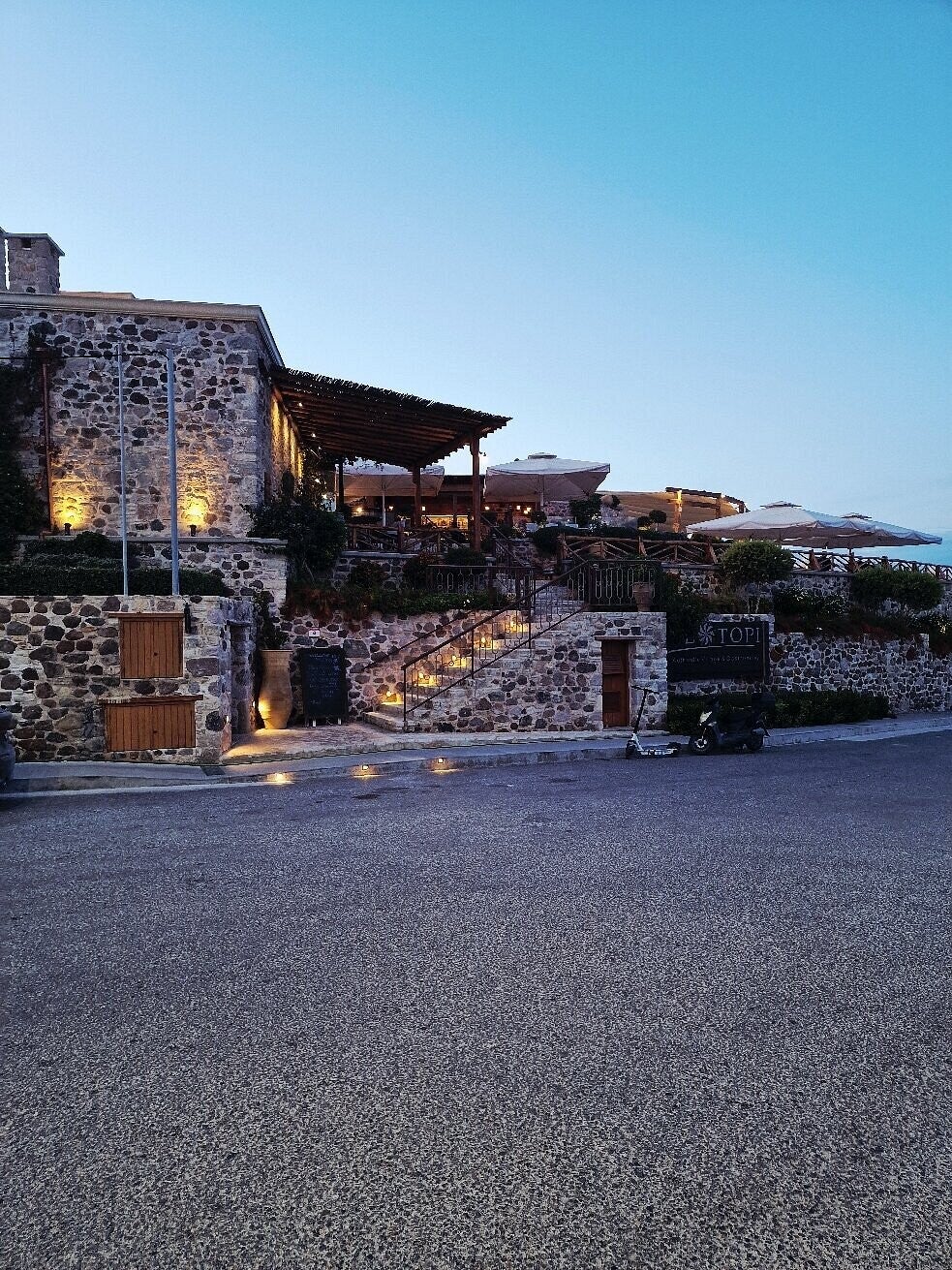 Mylotopi fungeert ook als restaurant met traditionele Griekse gerechten. Veel bezoekers komen hier vooral voor het eten, de sfeer en het uitzicht. Het is een populaire plek voor zonsondergangen en ook voor bruiloften. Je kunt er op je gemak rondlopen en daarna iets eten of drinken op één van de terrassen.